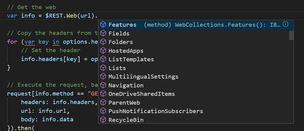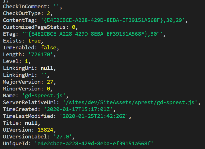 В этом примере кода будут получены файлы, хранящиеся в подпапке «sprest» библиотеки «Активы сайта». Мы будем использовать библиотеку $REST gd-sprest для генерации информации о запросе.